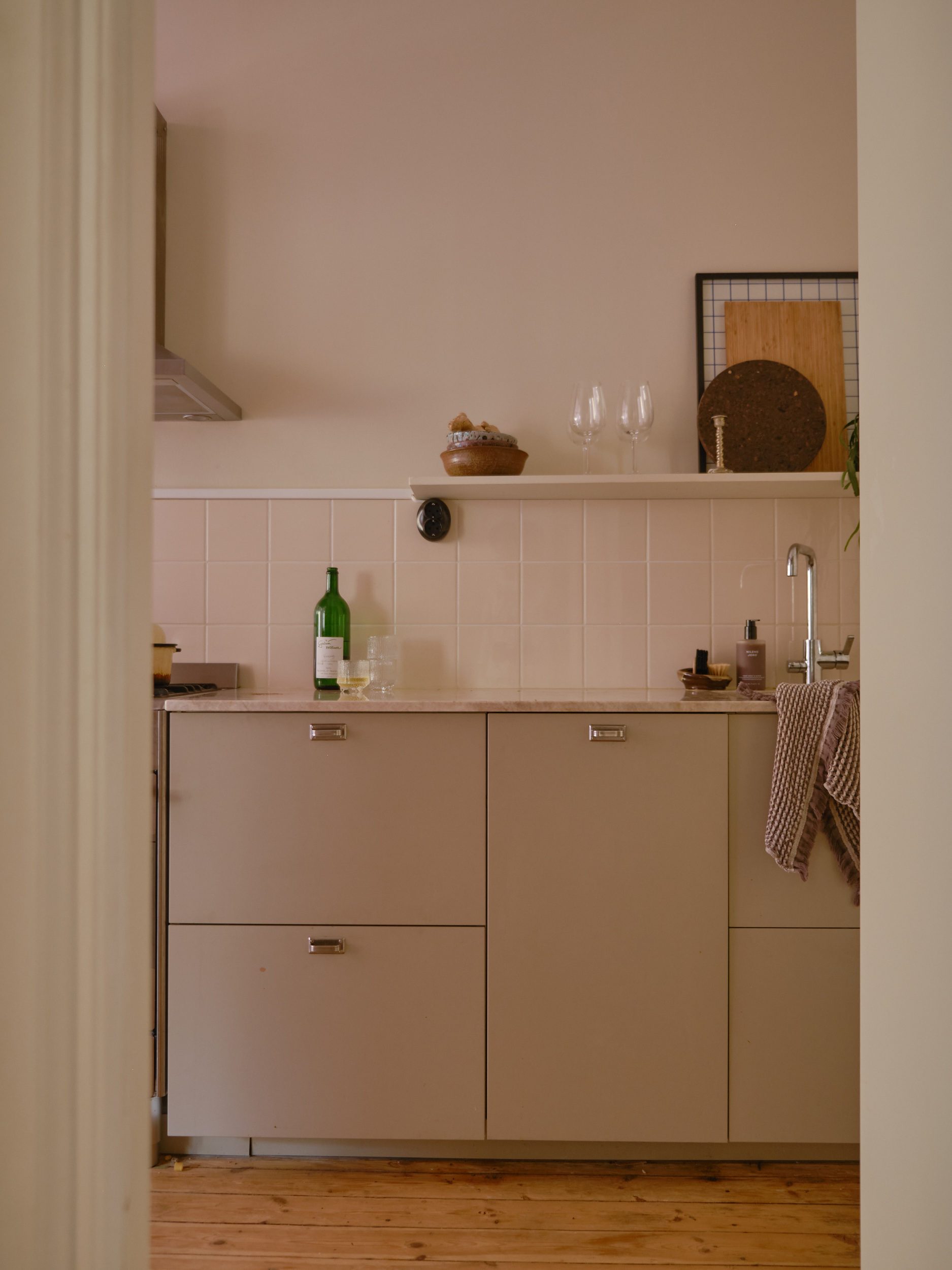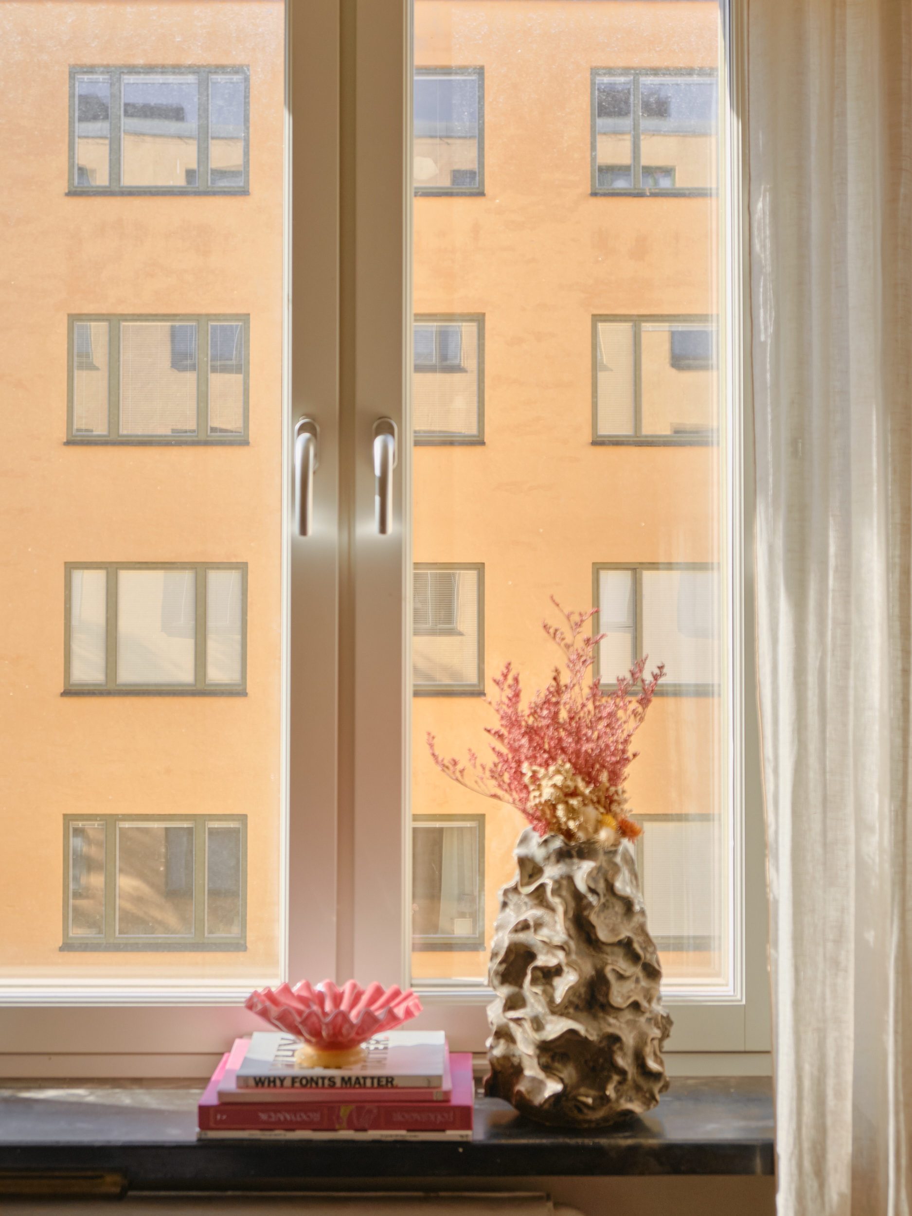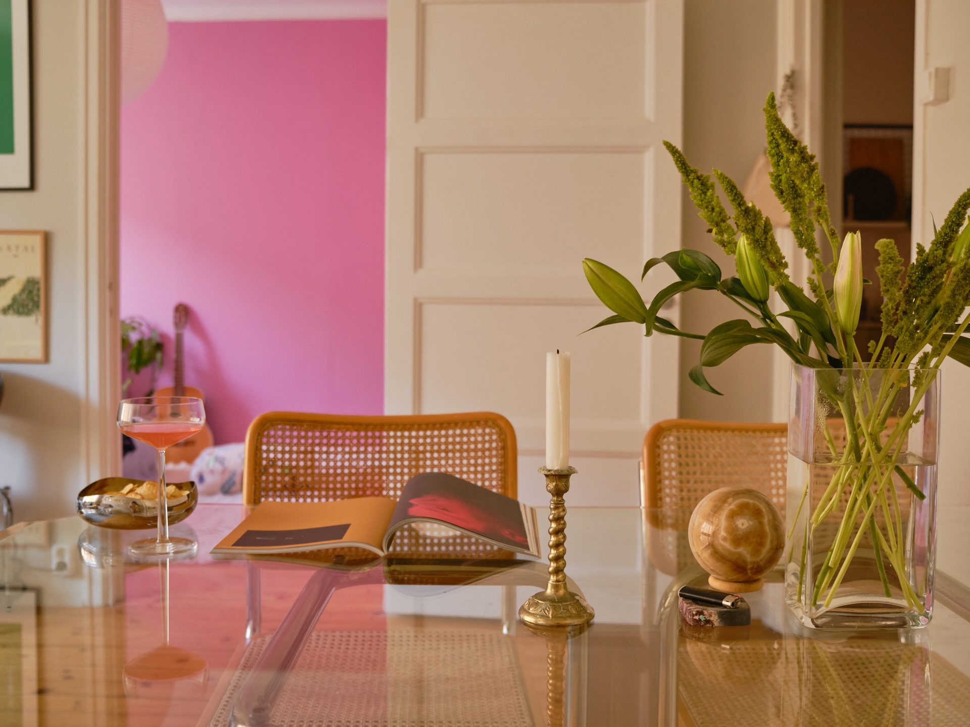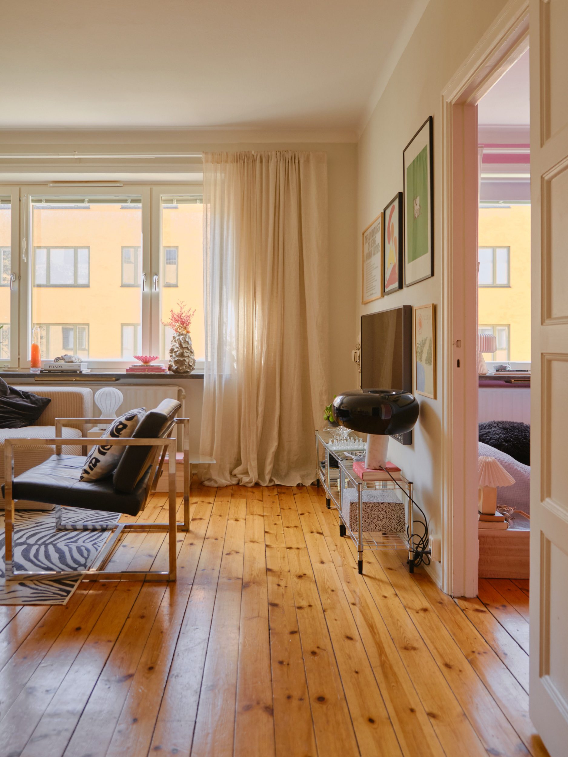 Lägenheten bär på fint bevarade kvaliteter i form av brädgolv, fönsterbrädor och spegeldörrar som harmonierar med det uppdaterade skicket på kök och badrum. I sovrummet, där väggarna är målade i en rosa kulör, är känslan mjuk och drömlik.
