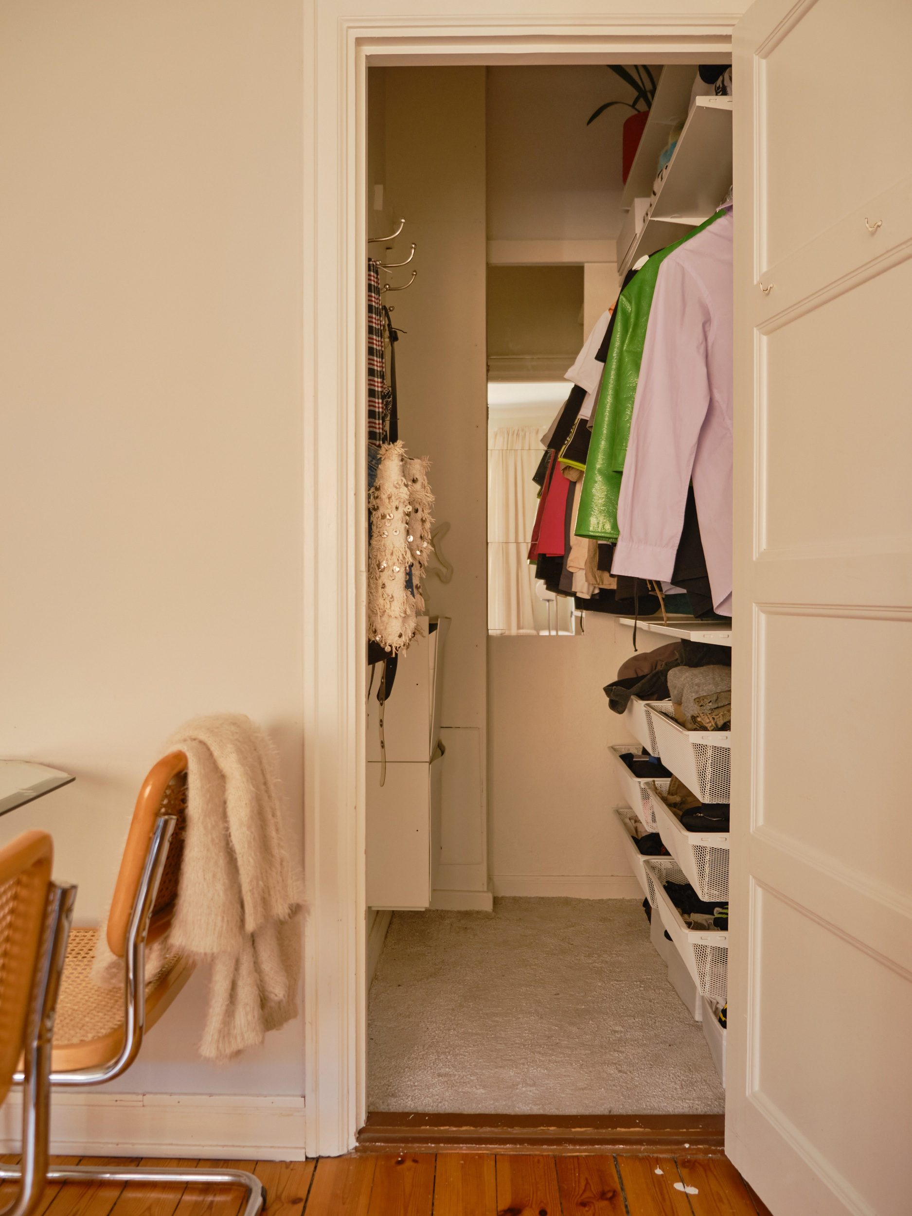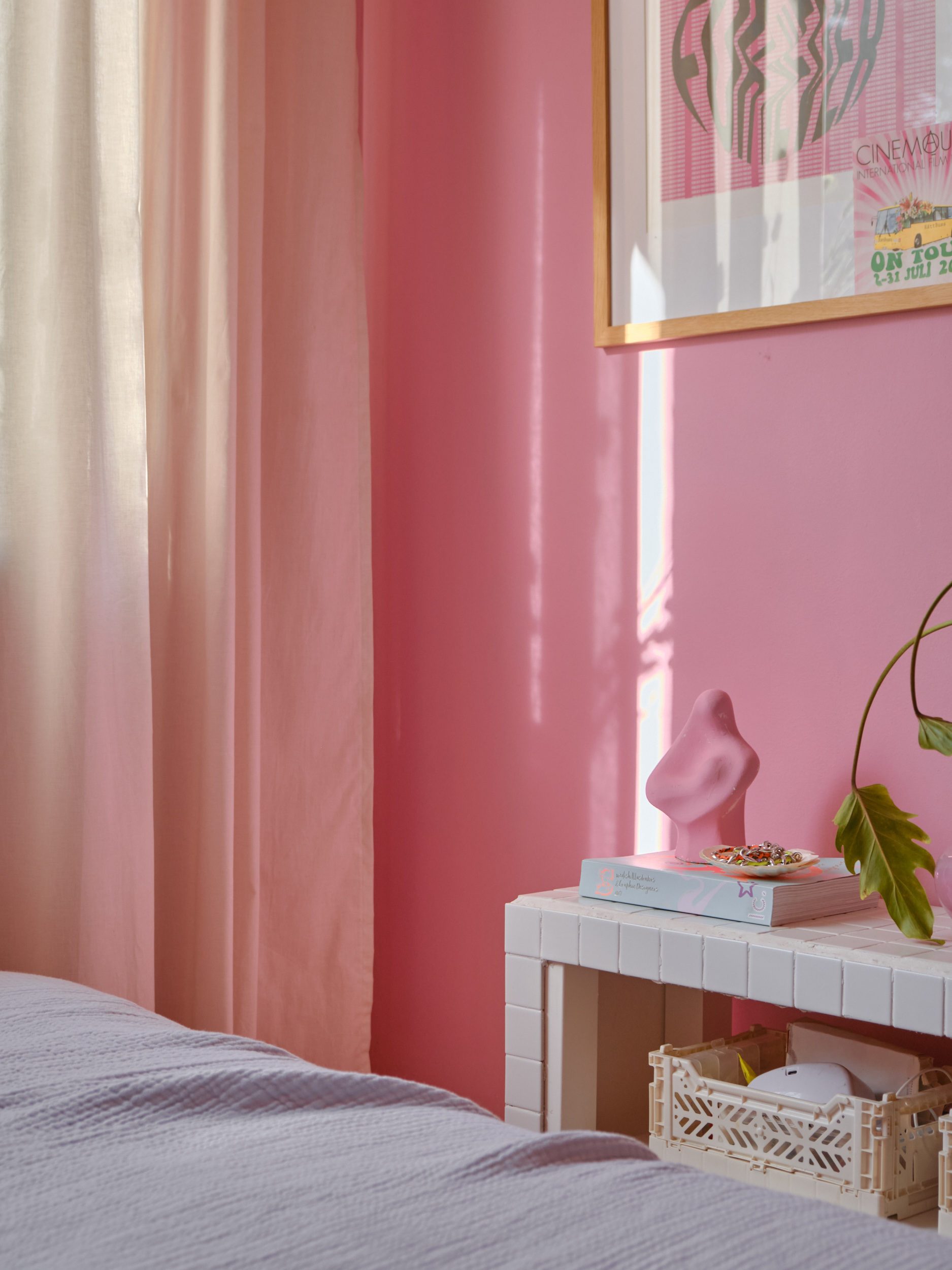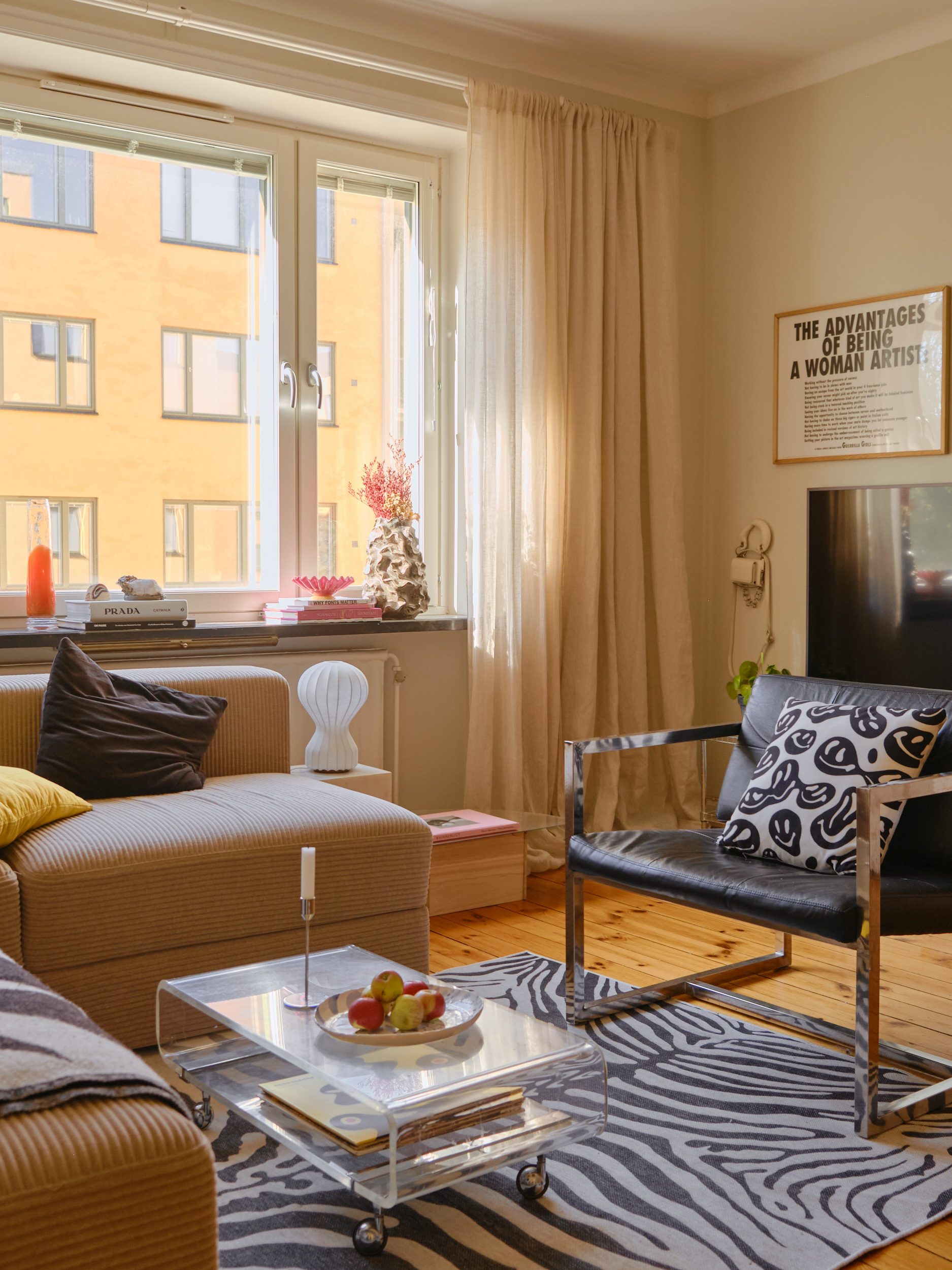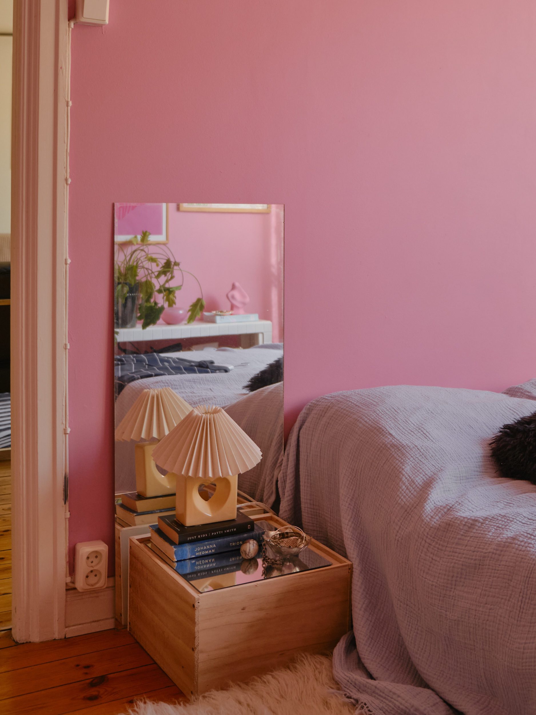 Lägenheten bär på fint bevarade kvaliteter i form av brädgolv, fönsterbrädor och spegeldörrar som harmonierar med det uppdaterade skicket på kök och badrum. I sovrummet, där väggarna är målade i en rosa kulör, är känslan mjuk och drömlik.